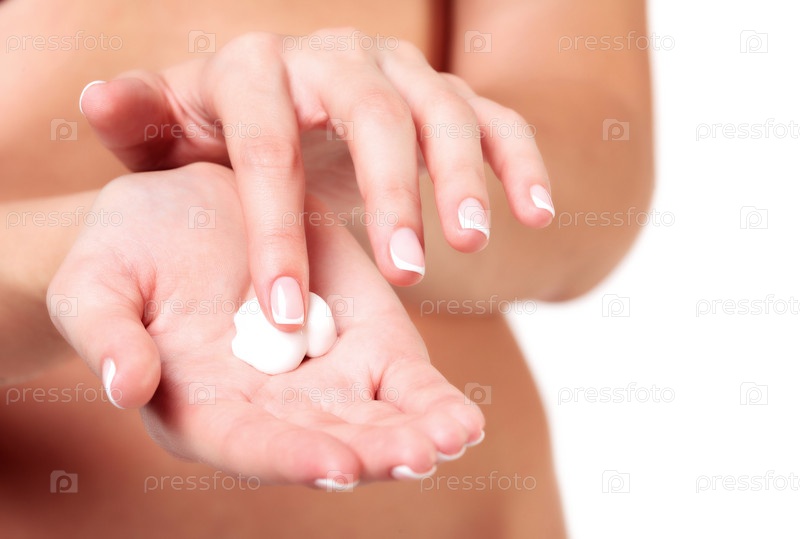 Крупным планом снимок рук красивой женщины с кремом, изолированных на белом фоне
