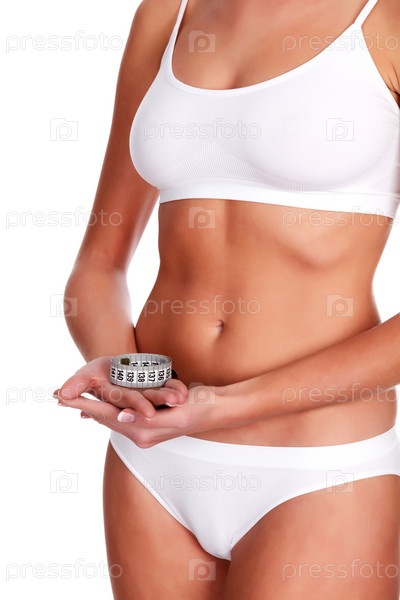 Стройная женщина с рулеткой, изолированная на белом фоне