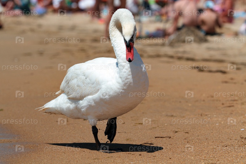 Большой белый лебедь на песчаном пляже