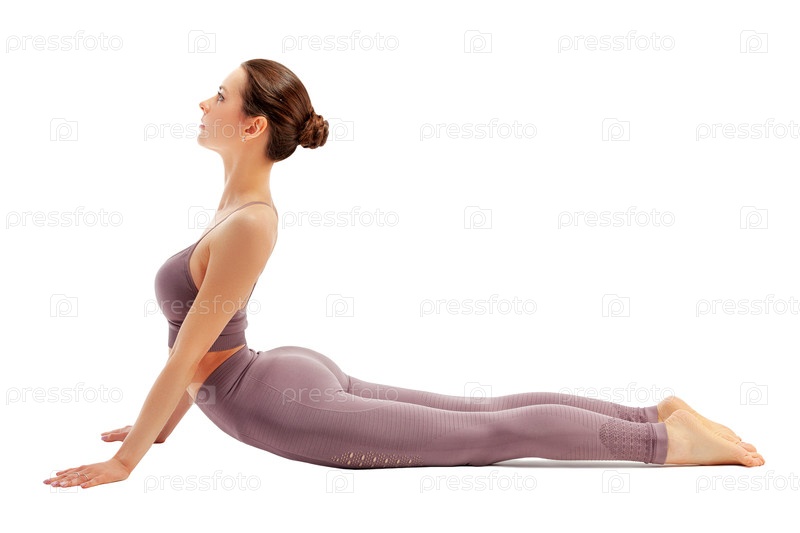Молодая женщина делает упражнения йоги, изолированная на белом фоне. Портрет в полный рост