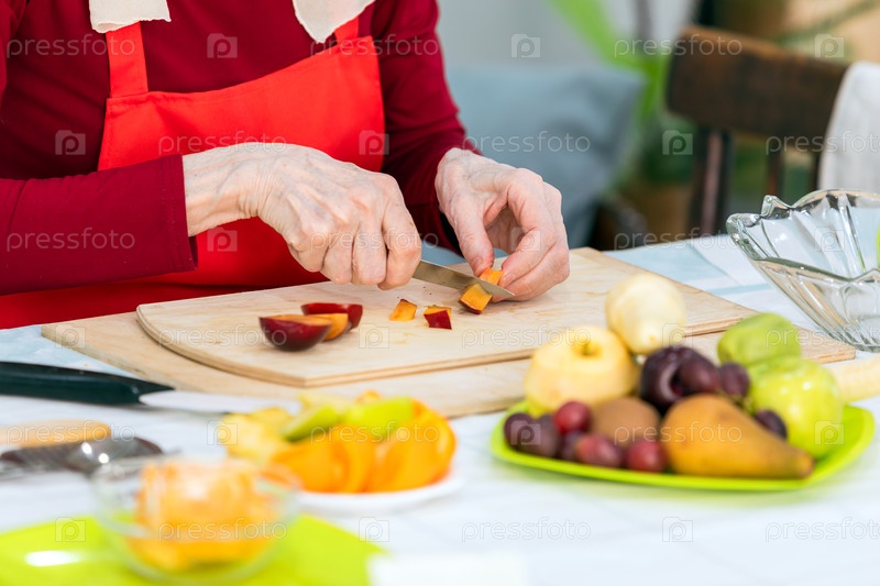 Крупным планом — пожилая женщина режет фрукты на кухне дома