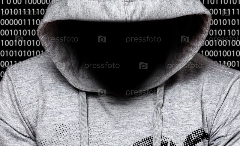 Хакер. Человек в капюшоне с лицом в темноте с цифровыми числами позади