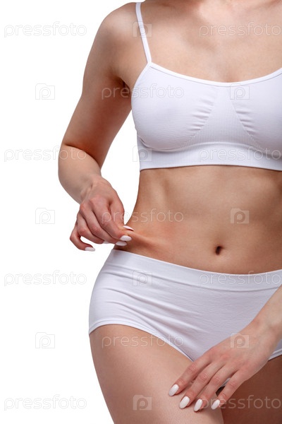 Женщина ущипывает жир на животе, снимок крупным планом