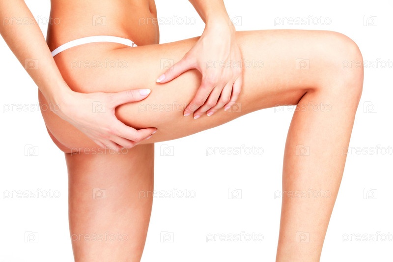Стройная молодая женщина щиплет бедро и ягодицу. Концепция диеты. Изолированный на белом фоне