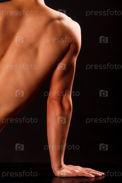 Рука и часть спины мускулистой женщины, позирующей на черном фоне