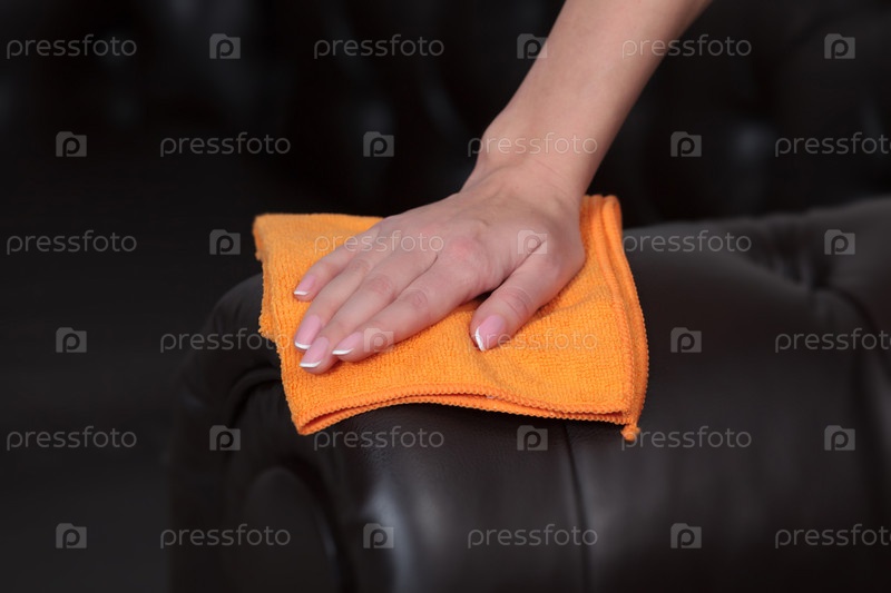 Крупным планом снимок женской руки, вытирающей коричневый кожаный диван-кровать Chester