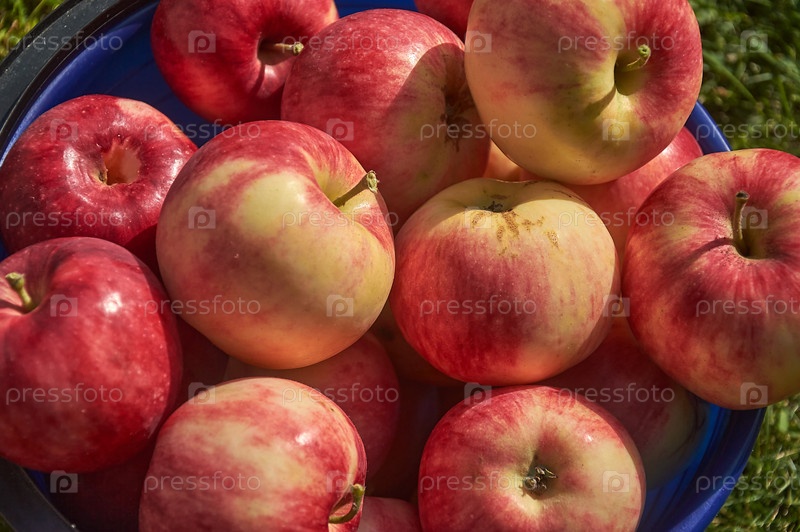 Спелые красные яблоки в пластиковом ведре на лужайке