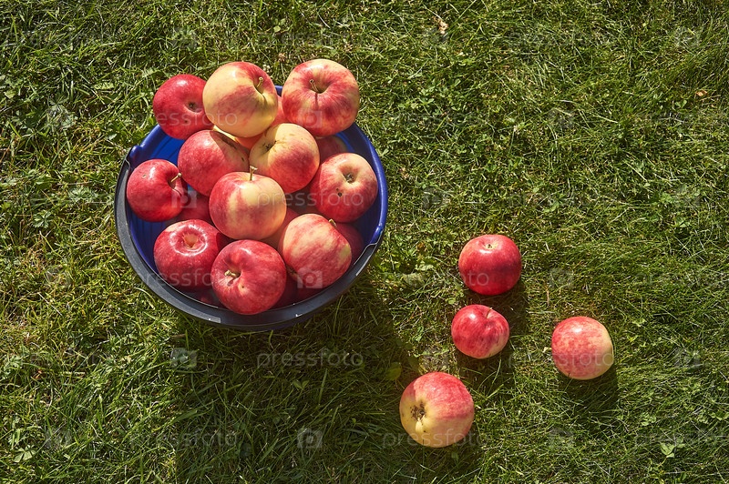 Спелые красные яблоки в пластиковом ведре на лужайке