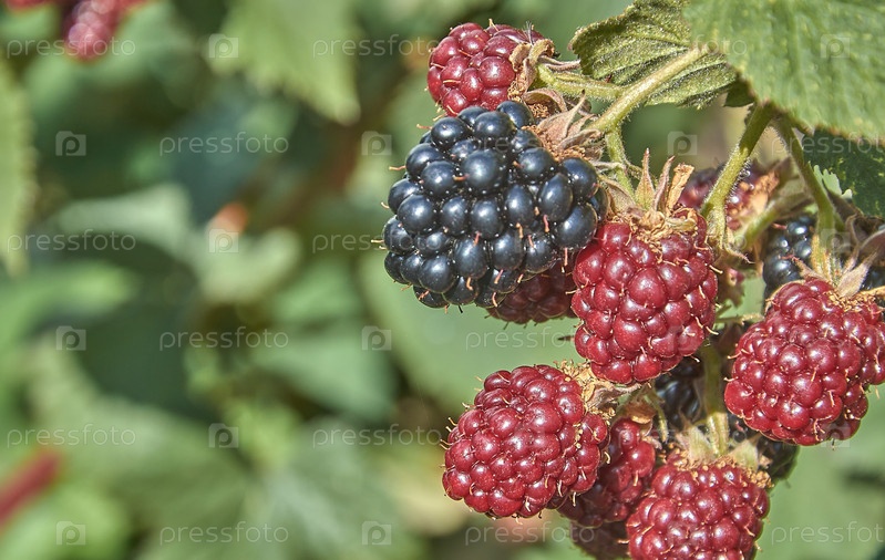 С куста висит гроздь незрелой ежевики