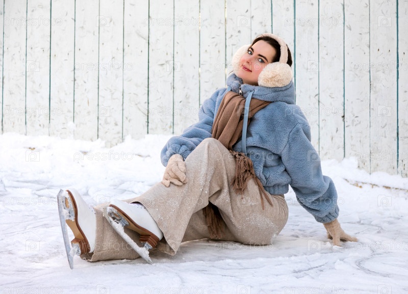 Портрет красивой молодой женщины, сидящей на катке