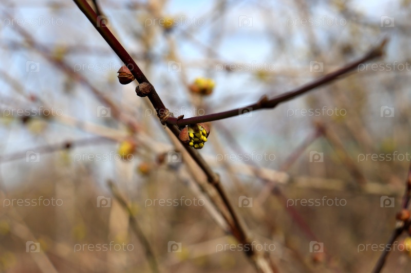 Ветка куста кизила в форме рогатки с распускающимися почками в полутени