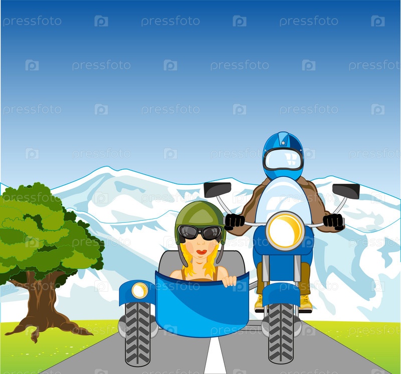Люди на мотоцикле с коляской едут по дороге среди летней природы