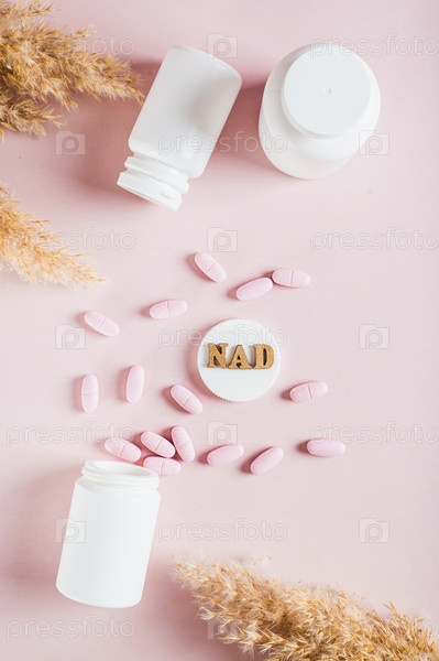 Молекула NAD+ в таблетках для борьбы со старением и биохакинга на розовом верхнем и вертикальном виде