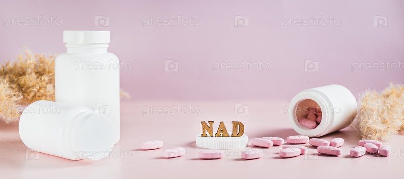 Никотинамидадениндинуклеотид таблетки и бутылки против старения на веб-баннере стола
