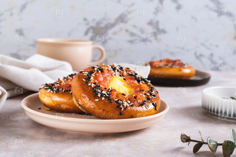Запеченные рогалики с помидорами и перепелиным яйцом на тарелке на столе