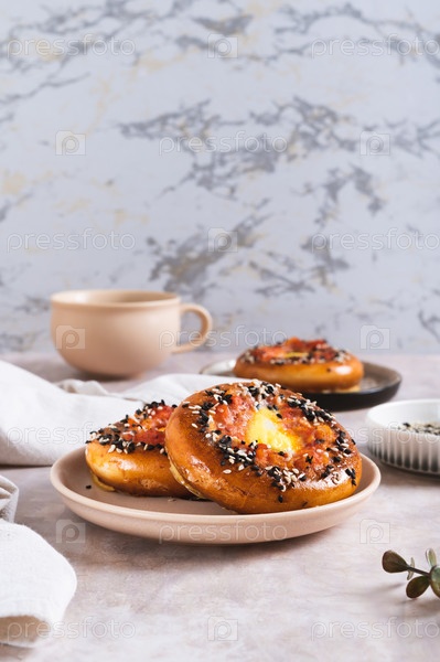 Запеченные рогалики с помидорами и перепелиным яйцом на тарелке на столе вертикальный вид