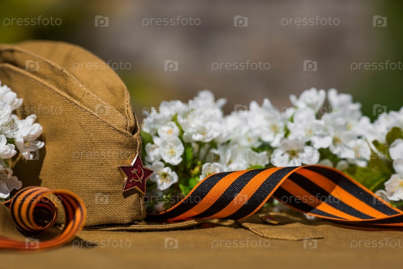 Баннер к 9 мая. Военная форма, фуражка со звездой, георгиевская лента и цветущая сакура на заднем плане. Концепция Дня Великой Победы 1941-1945 гг. и Дня защитника Отечества