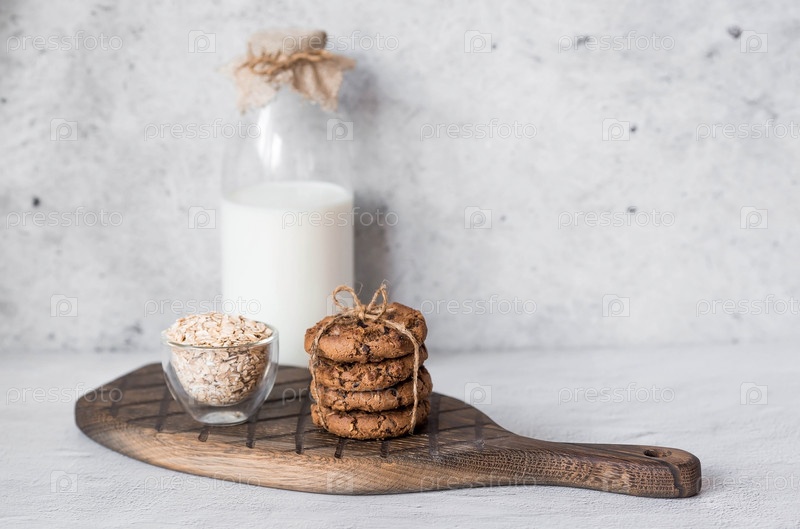 Стеклянная бутылка молока, овсянка, стопка овсяного печенья и стакан молока на стильной деревянной доске на бетонном столе. Деревенский стиль
