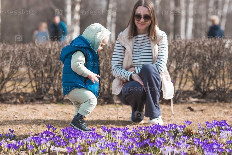 Красивый, веселый маленький мальчик двух лет гуляет с мамой по улице весной. Малыш играет на фоне весенних цветов в парке. Понятие родительства, детства и семьи