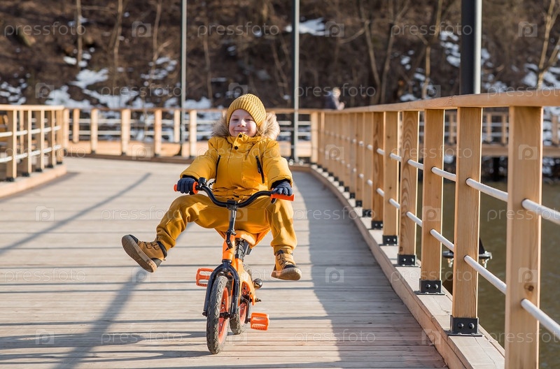 Милый мальчик в ярко-желтой одежде едет на велосипеде. Счастливый ребенок играет на улице ранней весной. Счастливое детство