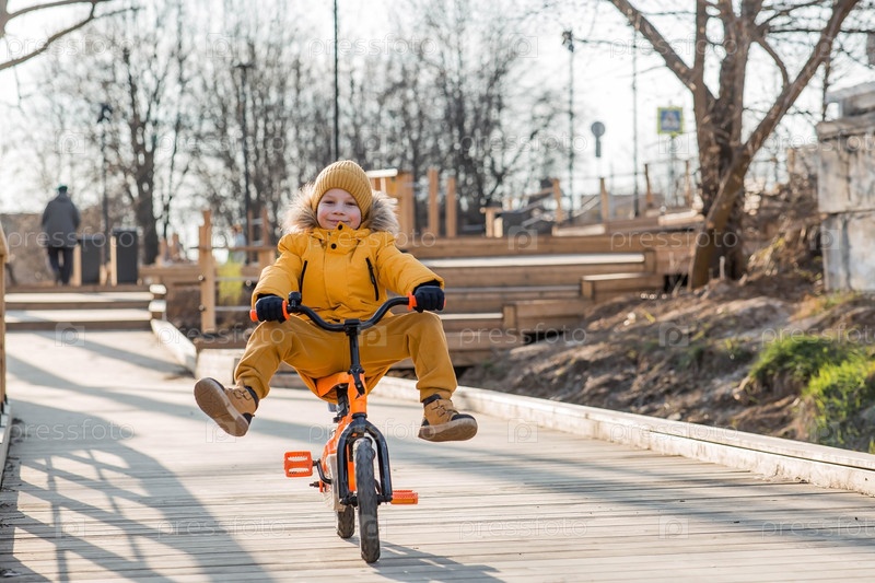 Милый мальчик в ярко-желтой одежде едет на велосипеде. Счастливый ребенок играет на улице ранней весной. Счастливое детство