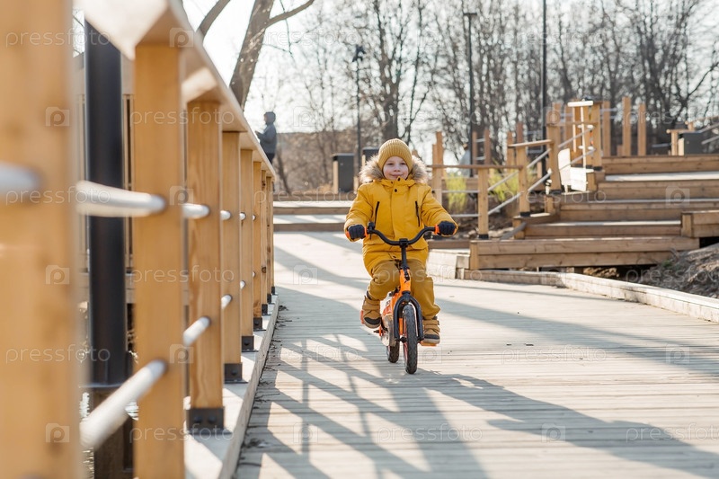 Милый мальчик в ярко-желтой одежде едет на велосипеде. Счастливый ребенок играет на улице ранней весной. Счастливое детство