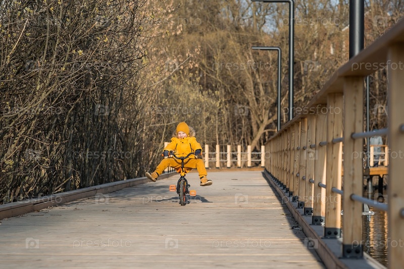 Милый мальчик в ярко-желтой одежде едет на велосипеде. Счастливый ребенок играет на улице ранней весной. Счастливое детство