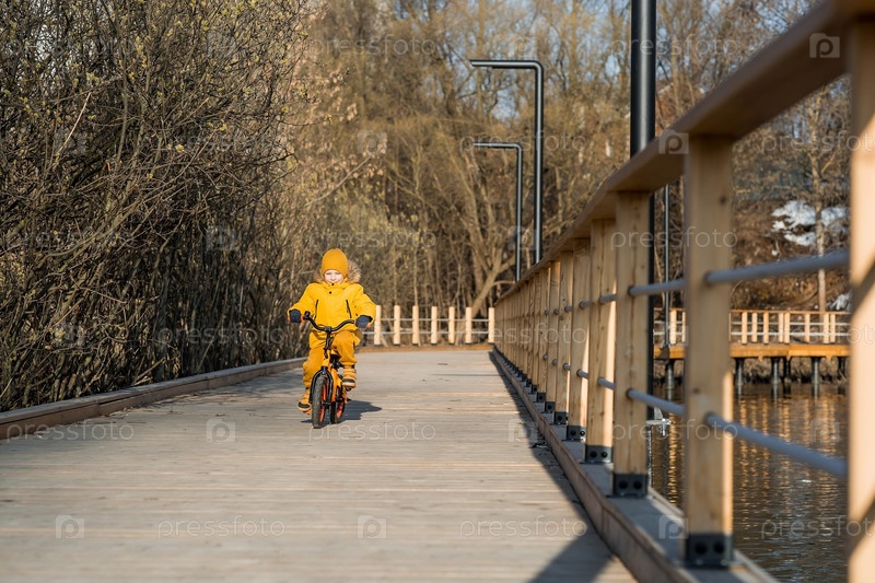 Милый мальчик в ярко-желтой одежде едет на велосипеде. Счастливый ребенок играет на улице ранней весной. Счастливое детство