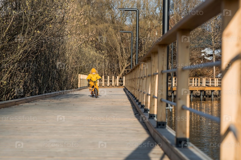 Милый мальчик в ярко-желтой одежде едет на велосипеде. Счастливый ребенок играет на улице ранней весной. Счастливое детство