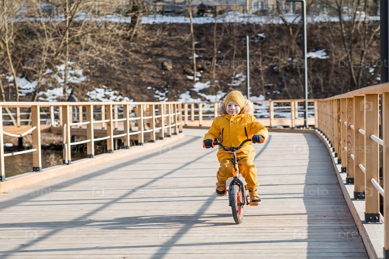 Милый мальчик в ярко-желтой одежде едет на велосипеде. Счастливый ребенок играет на улице ранней весной. Счастливое детство