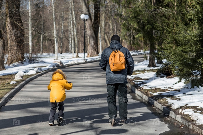 Маленький мальчик в ярко-желтой одежде и его папа катаются на самокатах. Счастливый ребенок и отец гуляют на улице ранней весной. Счастливое детство и семья