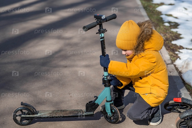 Маленький мальчик в ярко-желтой одежде едет на самокате. Счастливый ребенок гуляет на улице ранней весной. Счастливое детство