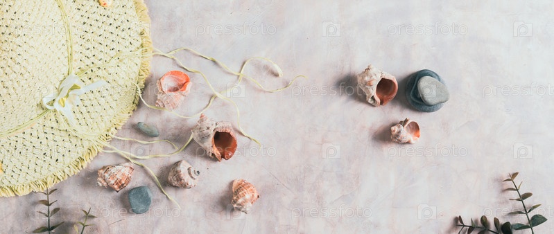 Фон путешествия, шляпа, ракушки, камни и ветки, вид сверху, веб-баннер