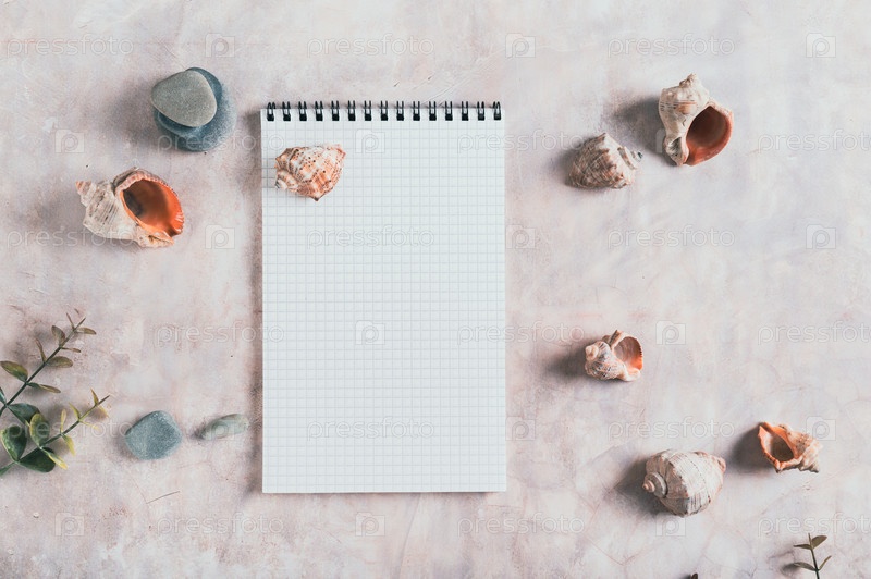 Блокнот для планирования путешествия, ракушки и камни на столешнице