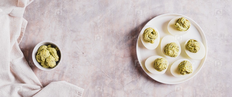 Авокадо фаршированные яйца для закуски на тарелке на столе вид сверху веб-баннер
