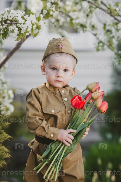 9 мая. Двухлетний мальчик в военной форме с букетом красных тюльпанов на фоне цветущей сакуры. Концепция Дня Великой Победы 1941-1945 гг. и Дня защитника Отечества