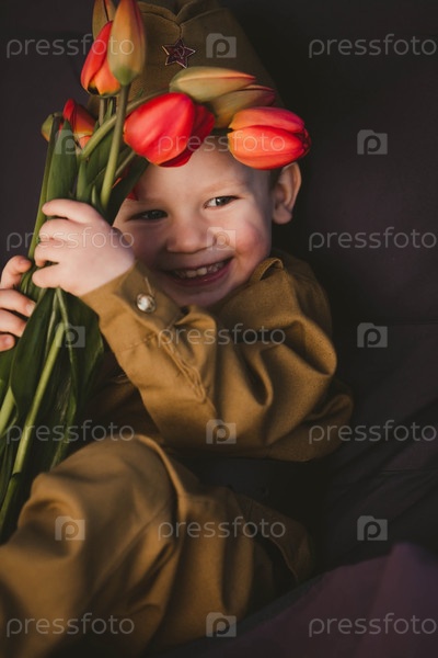 9 мая. Двухлетний мальчик в военной форме с букетом красных тюльпанов на фоне цветущей сакуры. Концепция Дня Великой Победы 1941-1945 гг. и Дня защитника Отечества