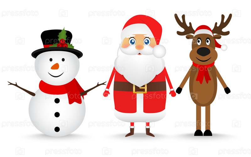 Санта-Клаус, олени и снеговик на Рождество