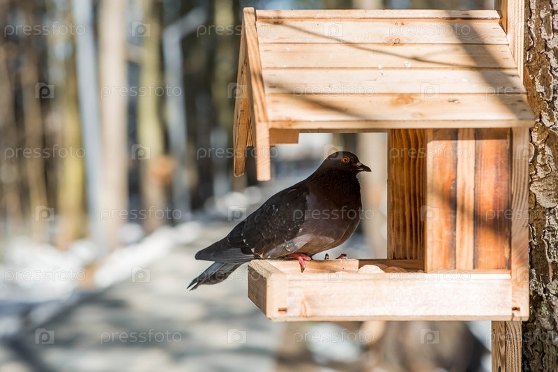Парк в солнечный день. Кормушки для птиц и животных. Голубь в кормушке. Забота и уход. Орнитология