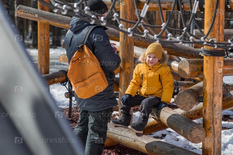 Мальчик в ярко-желтой одежде играет на детской площадке со своим отцом. Красивый портрет ребенка, играющего на улице ранней весной. Счастливое детство