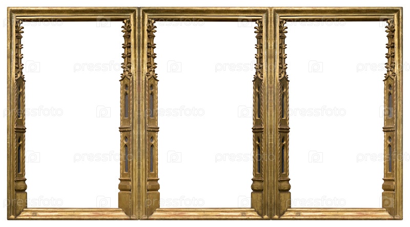 Тройная готическая золотая рама (триптих) для картин, зеркал или фотографий, изолированных на белом фоне. Элемент дизайна с обтравочным контуром