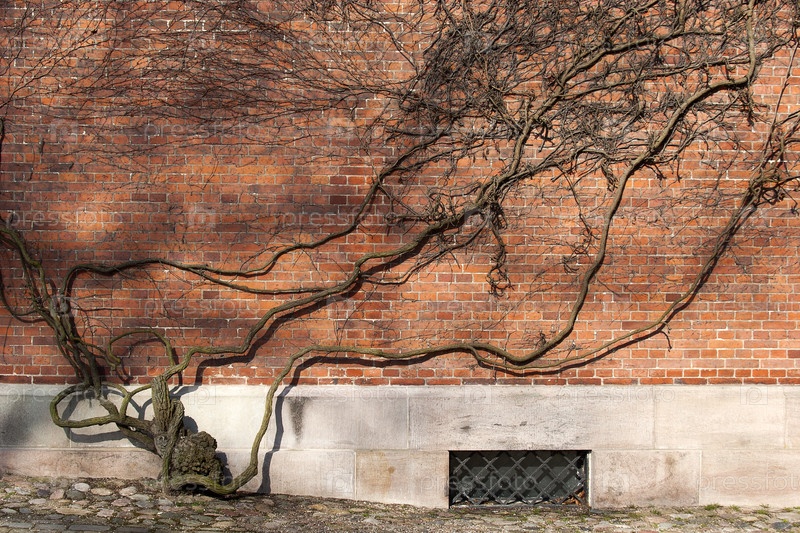 Изолированная старая кирпичная стена и сухой ствол старого дерева для создания дизайнерского фона (Собор Роскилле, Дания)