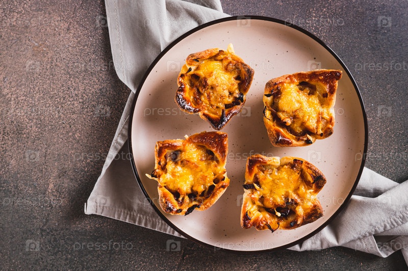 Крупный план мини-тарталеток с карамелизированным луком и сыром на тарелке на столешнице