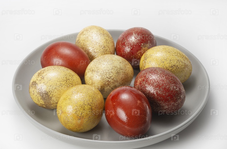 Красные и желтые куриные яйца с блестками на серой тарелке. Пасхальные крашеные яйца. Куриное яйцо с блестками. Традиционная христианская еда на Пасху