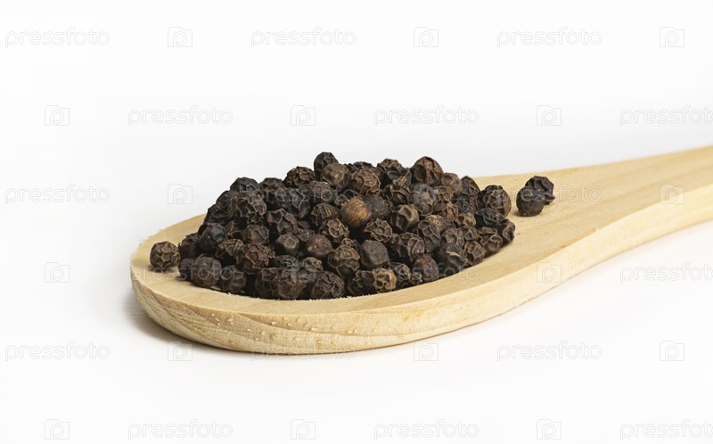 Черный перец горошком на деревянной ложке на белом фоне. Изолирован