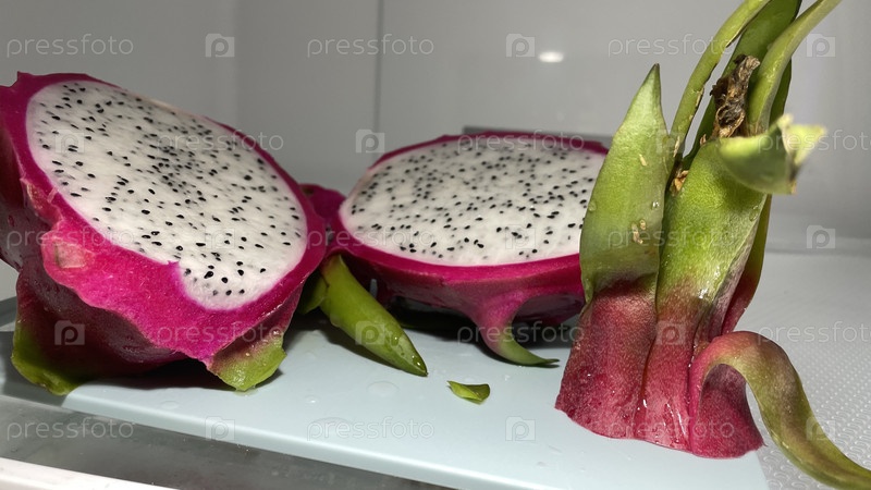 Большой красный плод дракона разрезают пополам и хранят в холодильнике