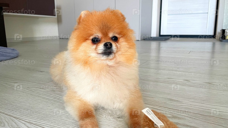 Маленький померанский шпиц сидит на сером ламинате крупным планом, карие глаза и коричневый нос