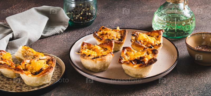 Мини-тарталетки с карамелизированным луком и сыром на тарелке на столе веб-баннер