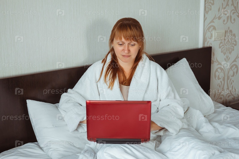 Рыжеволосая женщина в белом халате работает на ноутбуке в постели. Концепция удаленной работы