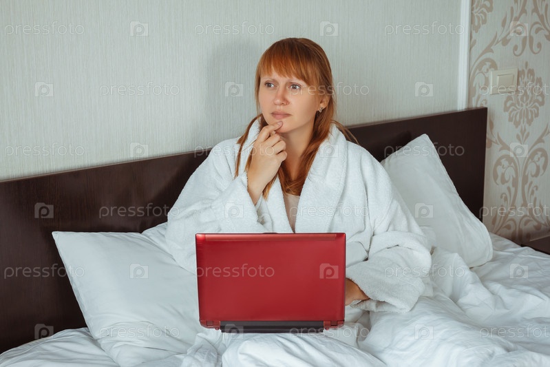 Женщина в белом халате в постели с ноутбуком думает и смотрит вдаль
